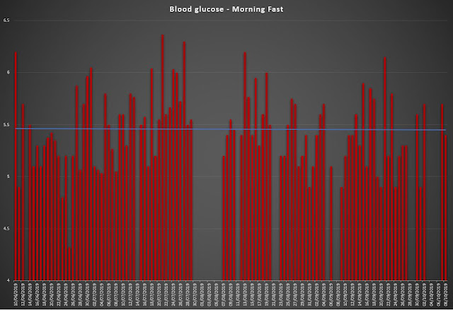 It shows that my fasting blood glucose does go up and down, some mornings it is high and others it is fine. Overall the average for the period is 5.45 which is normal. The average hasn’t changed for the period in question. I think that is probably a good thing. I’ve not been hyper vigilant on my inputs the whole time, I’ve just been living a normal healthy life generally.